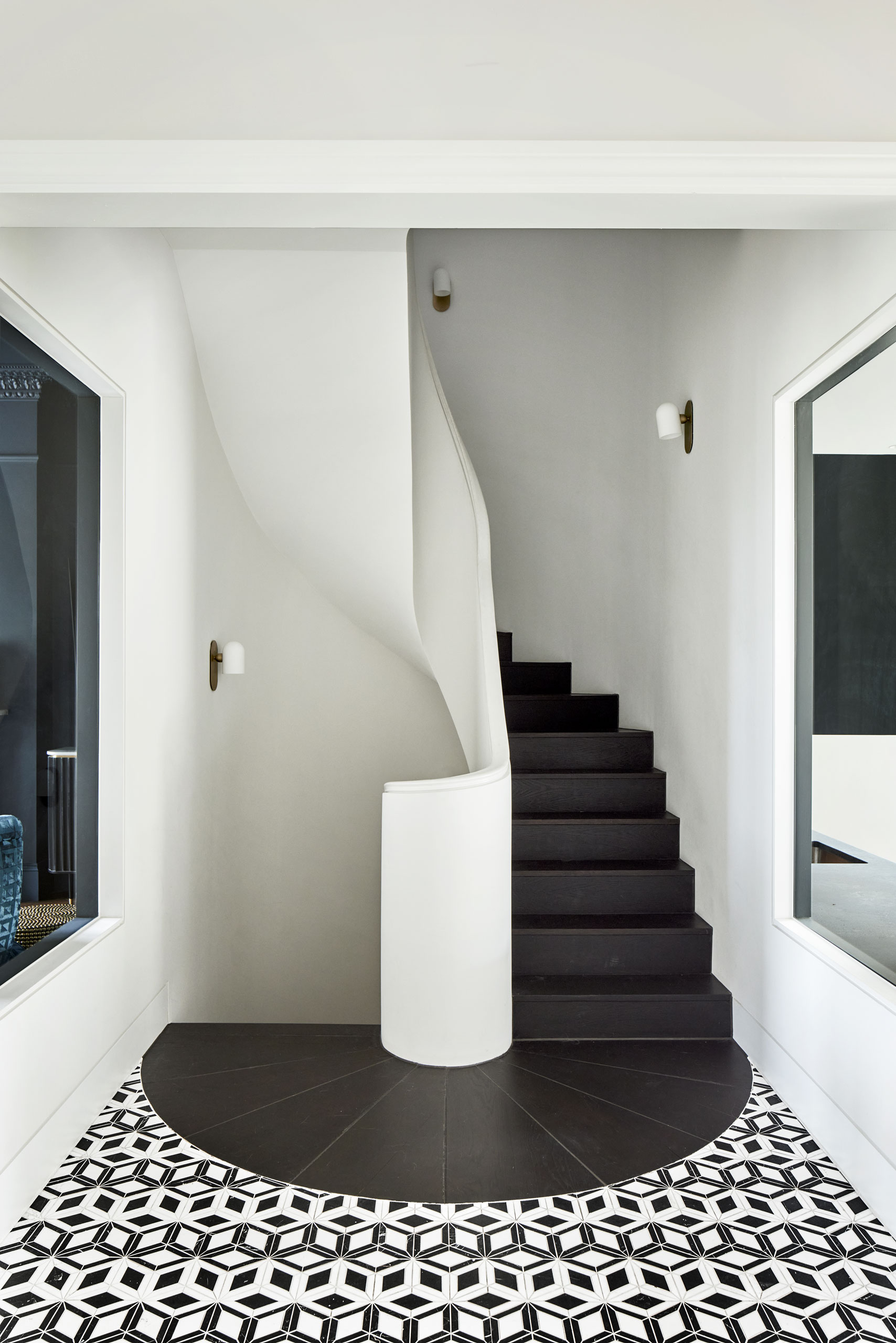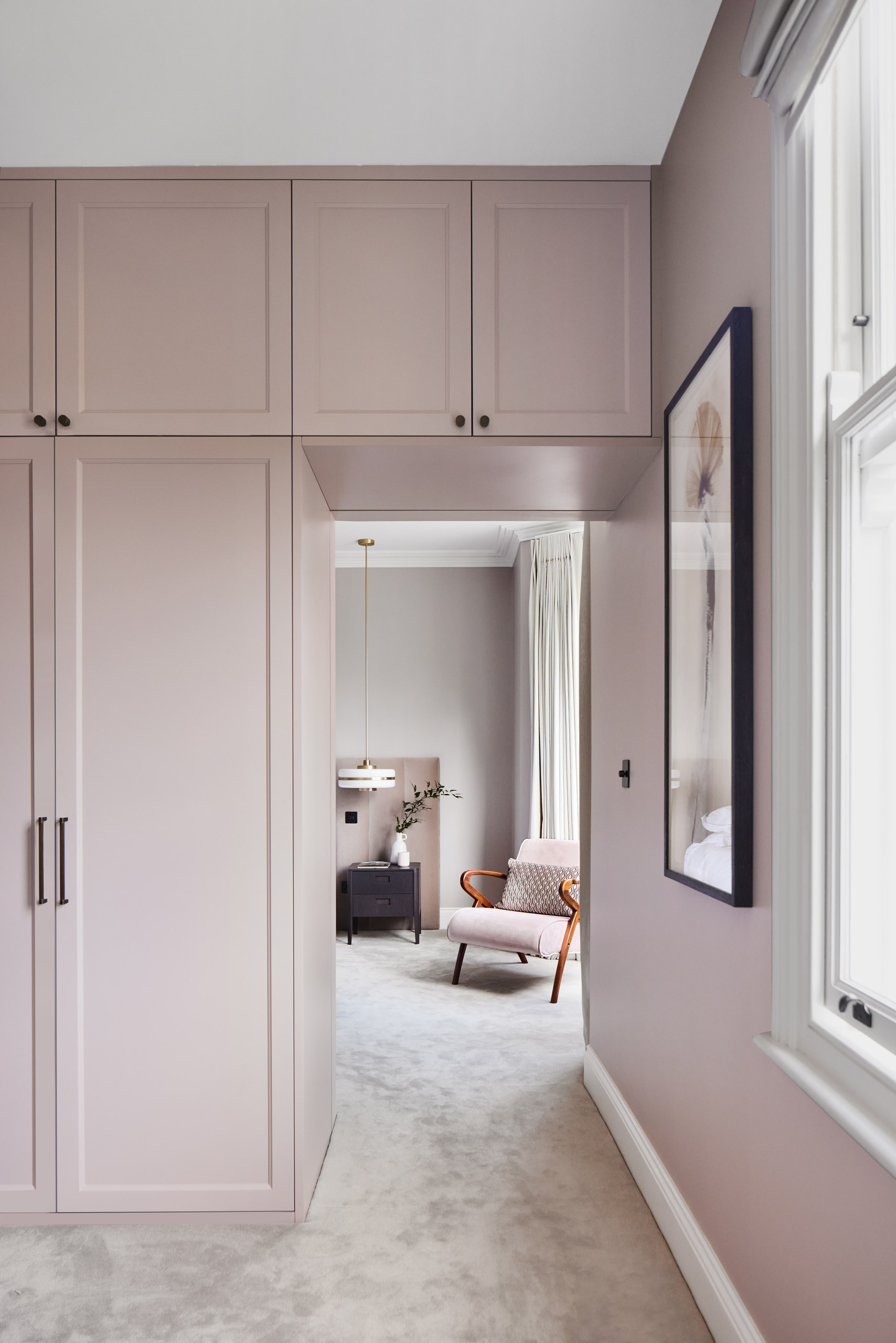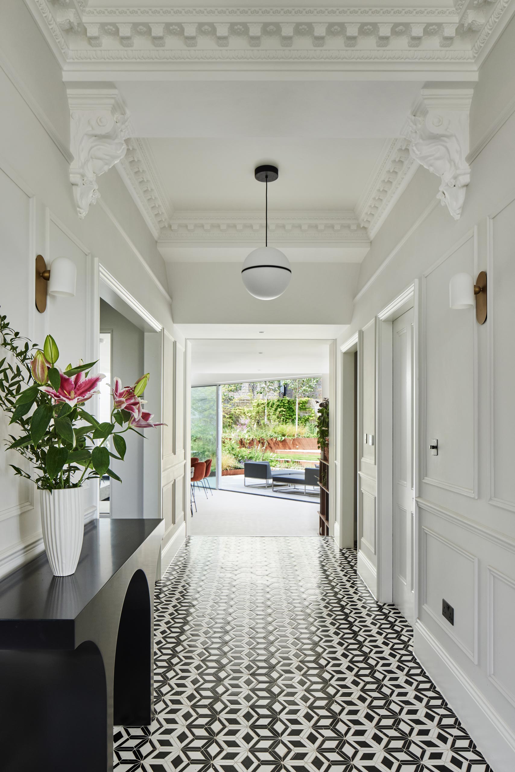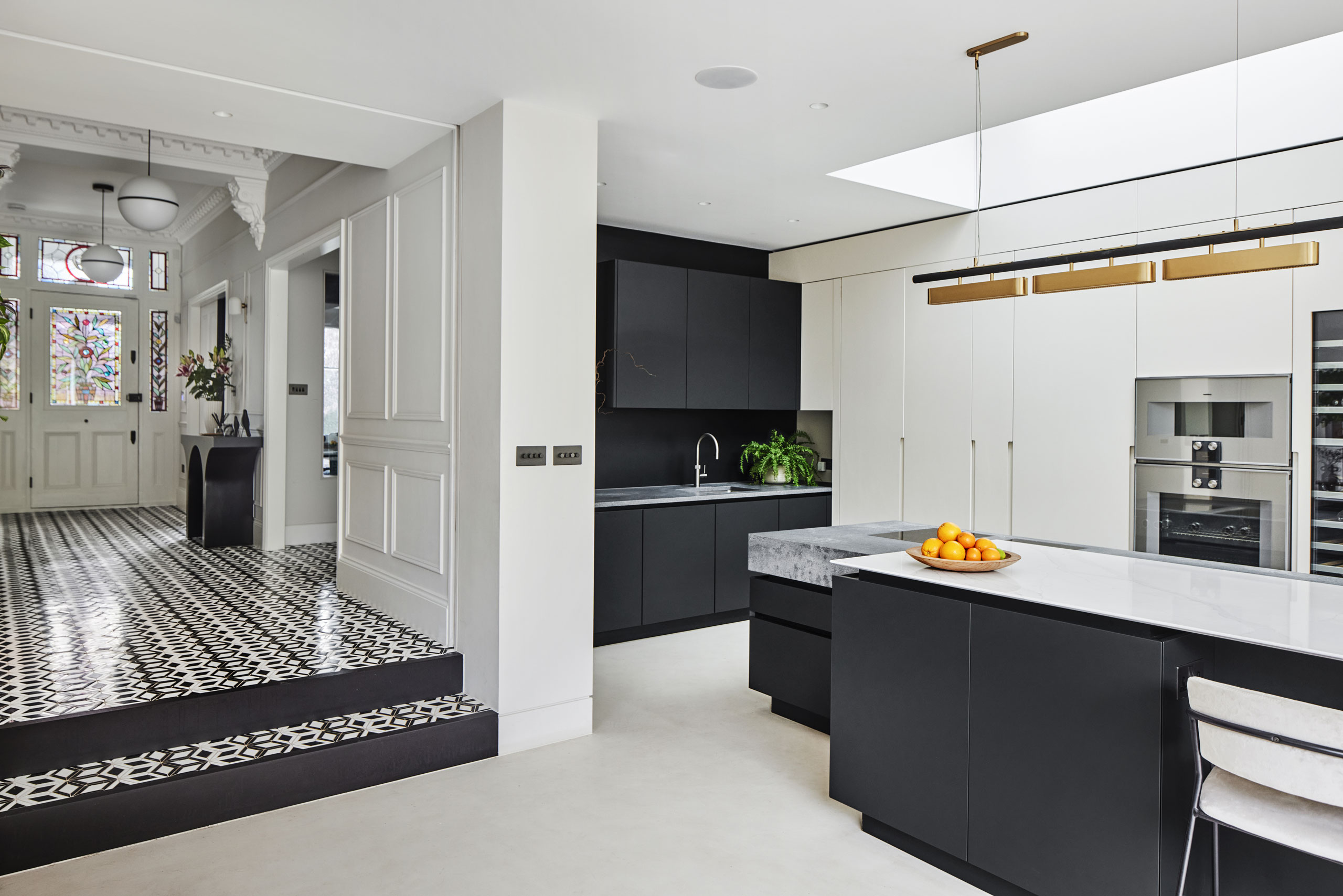 We moved the awkward stairs to a more natural position to one side of the hall, opening up a clear sight line to the garden from the front door. A new lightweight extension replaces the old, a timber structure faced with white cladding and durable blockwork. Wanting to optimise views, morning light and space for planting, we set its back wall at a 45-degree angle to the existing footprint. It now reaches out 9 metres from the house, masking the blank wall of the neighbouring extension and giving longer connection between inside and out. Inside, this living space now has the expansive feel and relaxed flow typical of Australian homes, a rooflight at its furthest point drawing the eye up and through the space. We placed the doors of the more orthogonal front reception rooms opposite one another to give more of this same flow in the original part of the house.